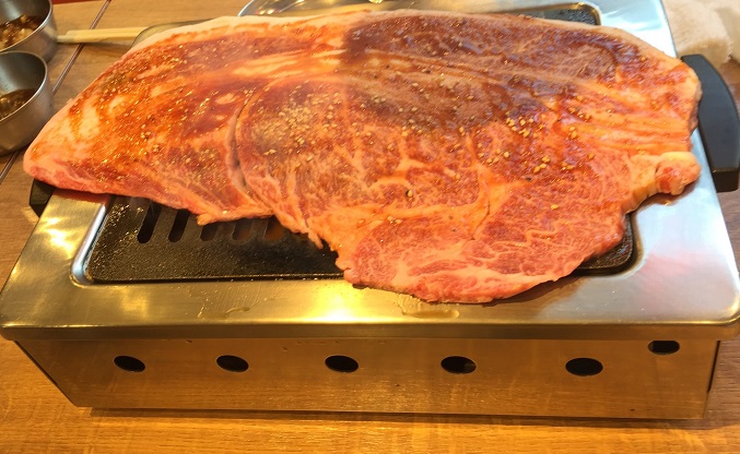 はみ出しカルビは看板メニューの1つで、注文すると、みんなでヨイショと掛け声が入り、大きいので盛り上がりますが、味はそこまでではないです。