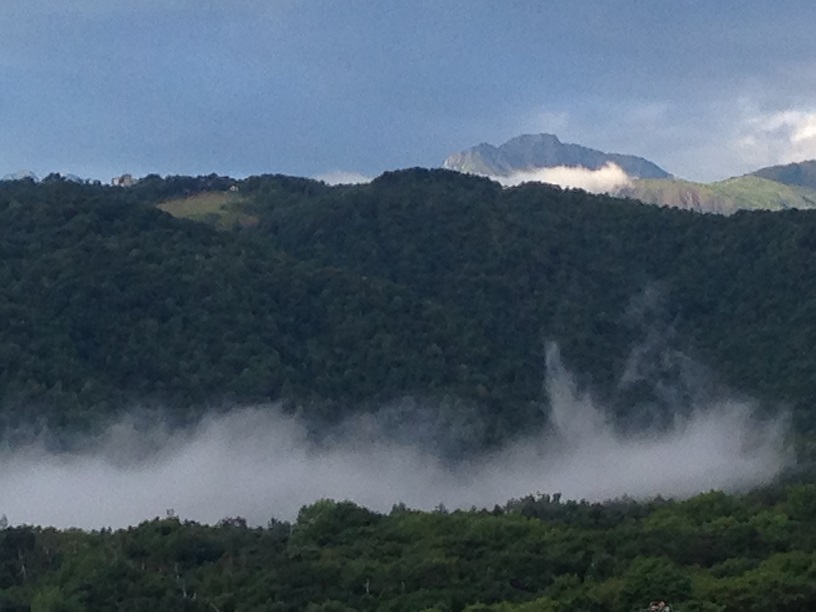 朝は清々しい空気をいっぱい吸い込みながら、ちょっと雲がかかった山を見ることができました。