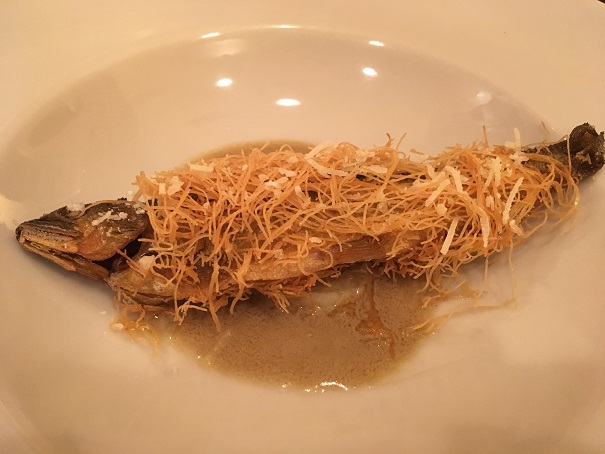 鮎のコンフィは、大人の味。食感もサクサクしているけど、食べると渋い鮎の苦みが、口の中に広がり、美味しいです。これは絶対におすすめです。もしかしたら、ワインよりも、日本酒に合うかもしれません。
