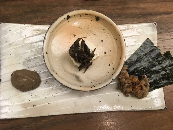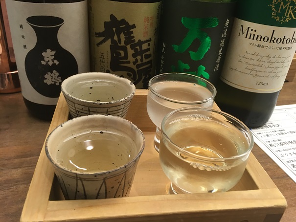 これは、900円で4種類の酒を飲み比べできて、とても、満足度の高くていいです。おつまみ3種の600円は、ちょっと割高感があるのですが、日本酒のほうはお勧めです。