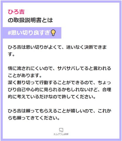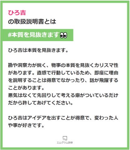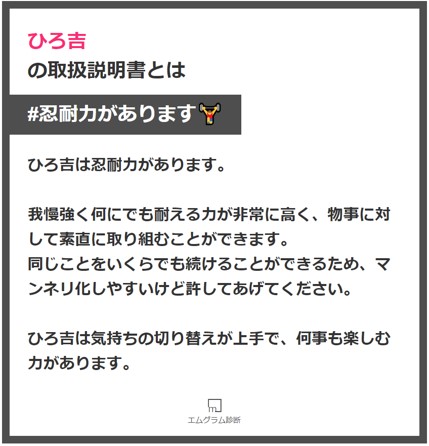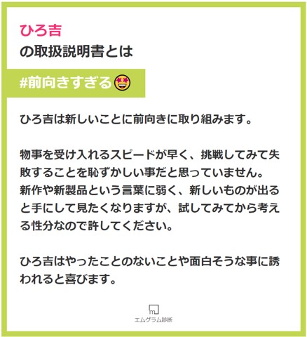 #思い切り良すぎ、#本質を見抜きます、#前向きすぎる、#忍耐力があります、そんなに違和感はないです。そして、自分の目指している方向に合致している気もするので、満足です。