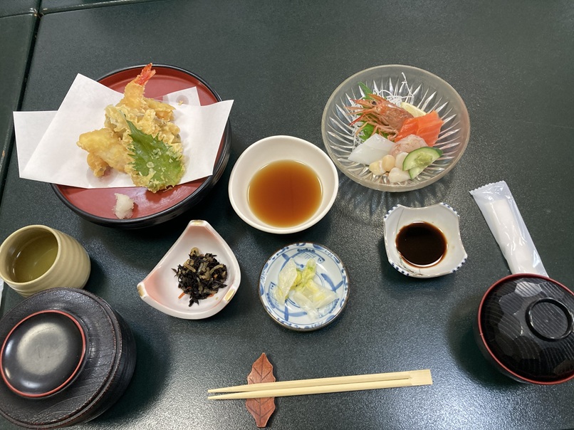 刺身があって、天ぷらがあるという定番の定食。なんか団体旅行で浴衣を着ながら大広間で食べる料理というイメージです。これに、チャッカマンで火をつける鍋があったら、完全にそれです。