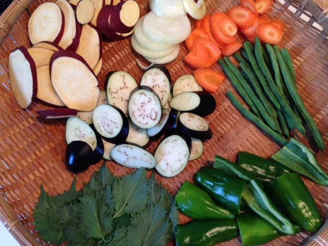 家で天ぷらパーティー。野菜ばっかり。でも、大地の野菜は美味しい。終了後、家が油のにおいで大変。