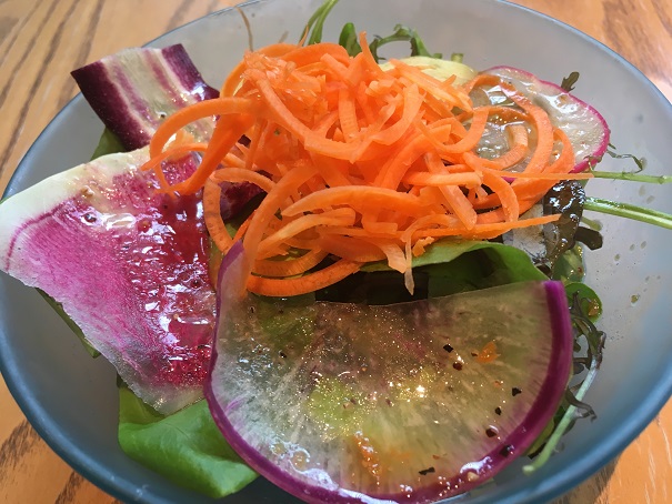 ベビーリーフ、グリーンリーフ、きゅうりのサラダ 人参ドレッシング