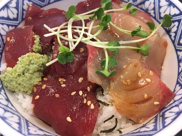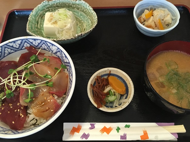魚を食べさせる昔ながらの居酒屋がやっているランチで、味はそこそこ美味しいし、小鉢や豚汁もついていて嬉しいのですが、カンパチとまぐろ丼で1300円というのは、やっぱり高すぎる気がします。ボリュームもそれほどあるわけではないので。