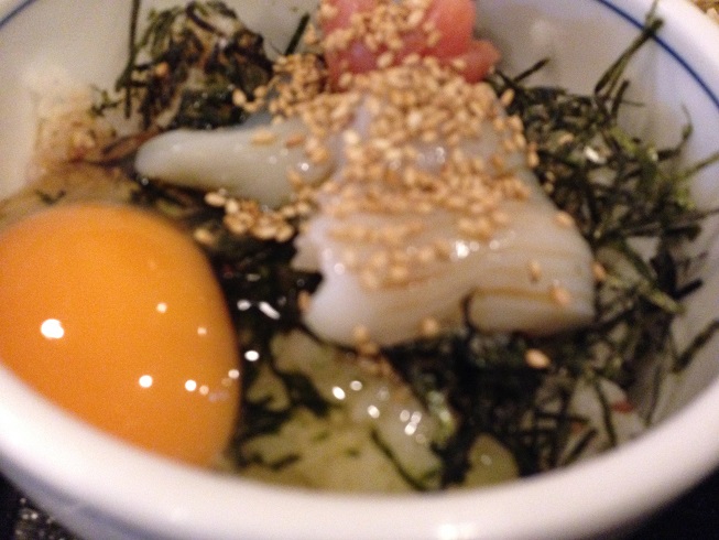 次に、イカ素麺の丼。店の外に展示されていた烏賊は、もっと量があるように思ったんですが、実際に出て来たのは、かなり少なかったです。ご飯に対する烏賊とタラコの割合が小さすぎるので、がっかりしちゃいました。