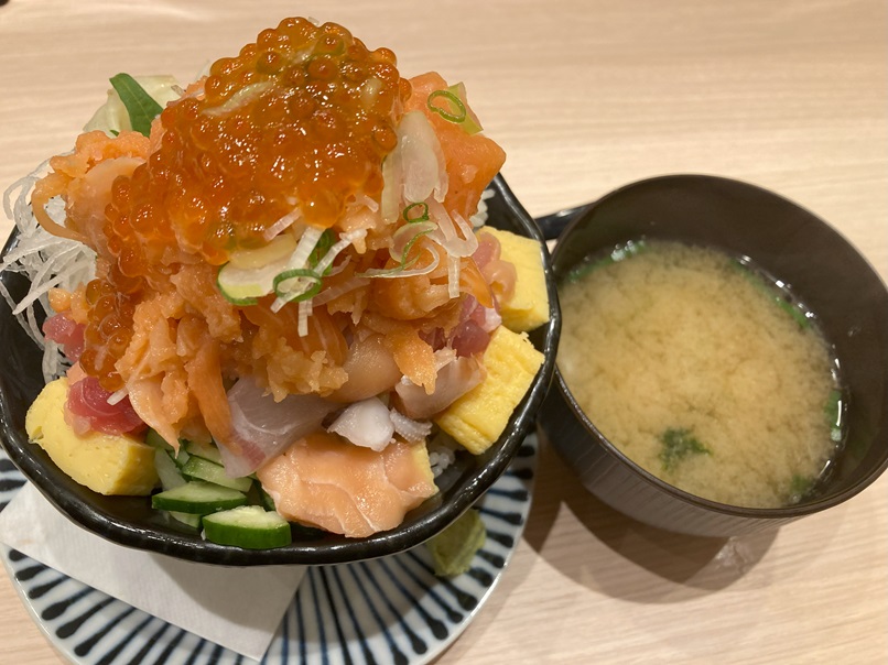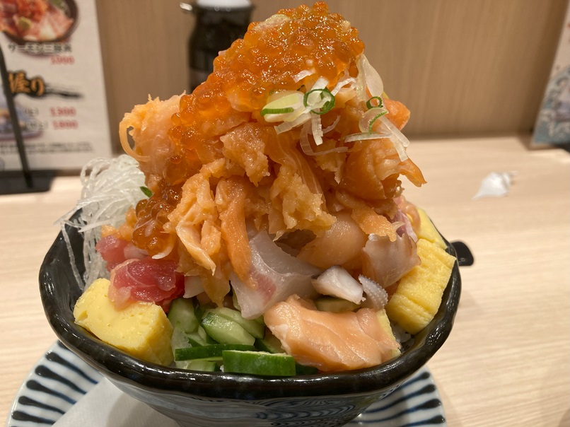 でも、ちょっと食べにくいです。海鮮だけ上から食べて、ごはんを後から食べるんじゃなくて、ごはんと一緒に食べたいと思うと、ネタが崩れ落ちちゃいます。