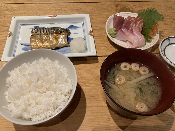 日替わりの定食、刺身がついて、トロサバの焼き魚ということで、かなり盛り上がりました。