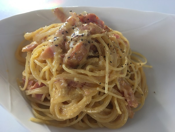 パスタはちょっと少なめの印象ですが、麺にコシがあって、美味しいです。