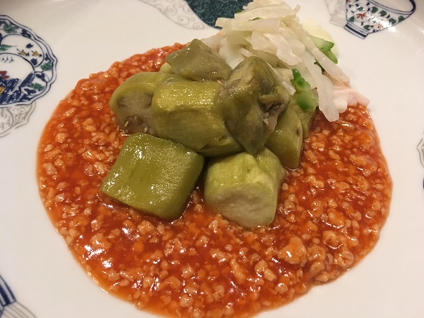麻婆豆腐フリークの私としては、当然麻婆豆腐ですが、出てきたものを見て、少しびっくり。唐辛子がいっぱいあるじゃないですか。これは辛すぎやしないか、不安になっちゃいました。