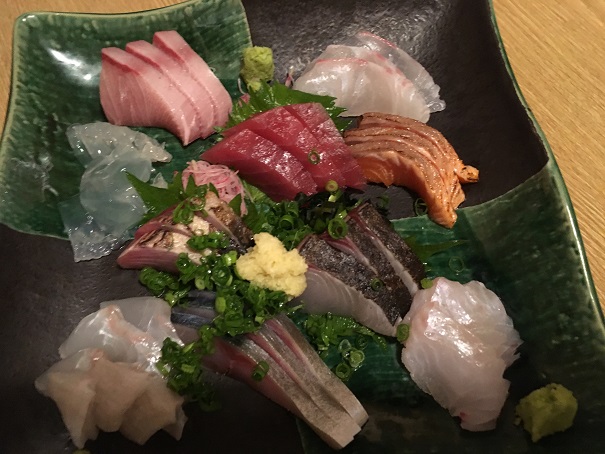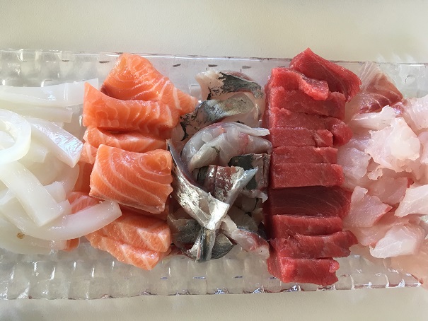 今日の魚は、まぐろ、真鯛、アジ、サーモン、ヤリイカです。美味しくいただきました。