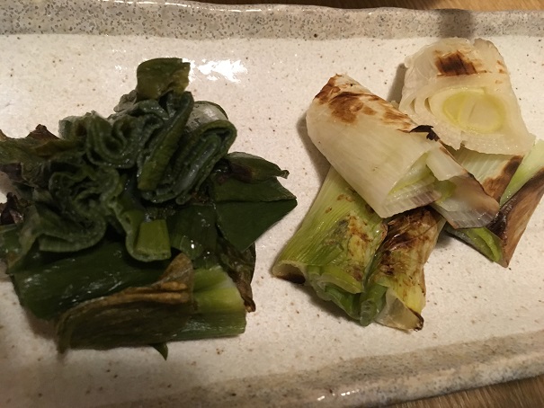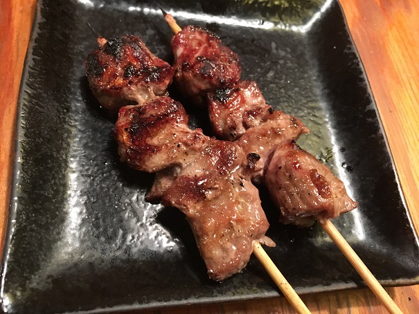 そして、刺しということで、ガツとコブクロをタレでいただきました。串に刺さった形で出てくるんですね。焼かずに食べるのもなかなかなもんです。