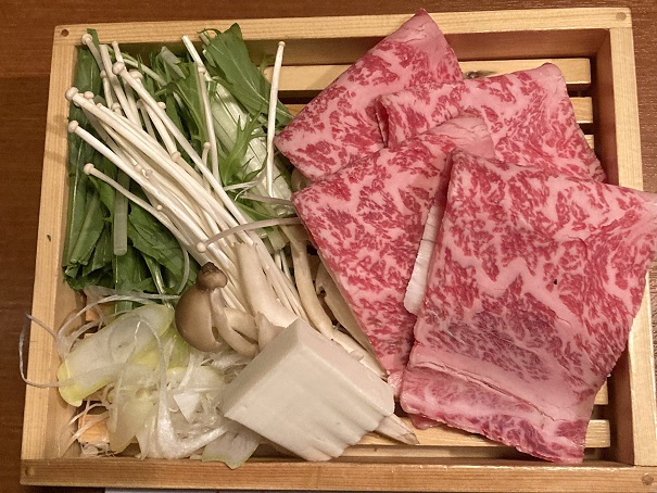 いくつかのランチは時間がかかると言われたけど、肉を食べるのは必須だったので、会席にしました。しゃぶしゃぶかすき焼きが選べたのですが、迷いに迷った末、すき焼きにしました。