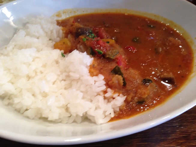 この日のカレーは2種類あり、牛肉とラムのスパイシーカレーと野菜カレー。店員さんの説明では、辛めということでしたが、どちらかというと辛くないカレーでした。もう少し辛いといいのになぁ。