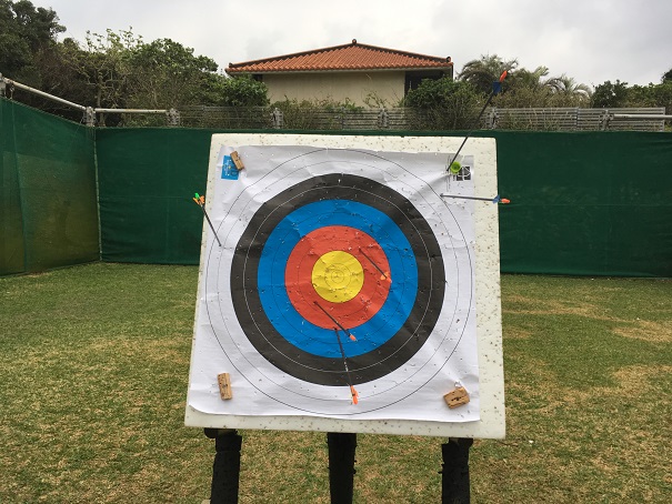 最初は年齢制限から、無理だと言われていた長男も中央の黄色の部分に矢を射ることができて良かったです。私自身も黄色に刺さり、満足です。何本も射ると、手の筋肉が披露して、ブレてしまうので、筋力がいるスポーツだということを理解しました。