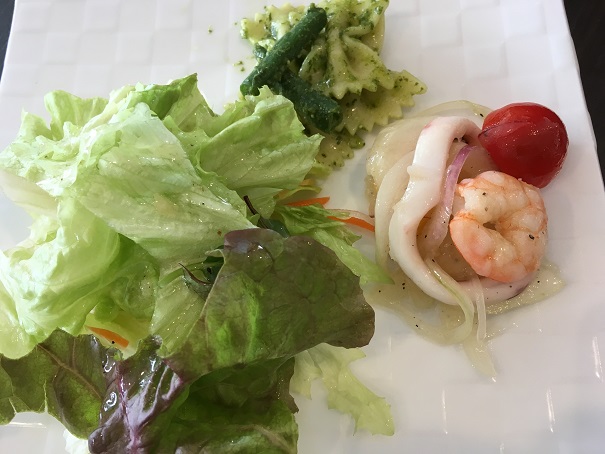 いろいろなコースがありますが、サラダと2種類のデリ+メイン+パン+デザート、そして、ドリンクバーをワインに変えました。