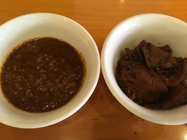 そして、刺しということで、ガツとコブクロをタレでいただきました。串に刺さった形で出てくるんですね。焼かずに食べるのもなかなかなもんです。
