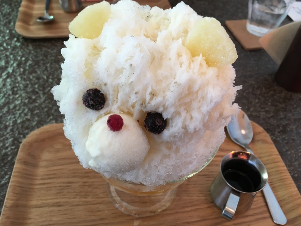 鹿児島のカフェということで、ちょっと季節外れではあるものの白くまを注文。私がいつも食べるコンビニのものとは違って、熊の形になっていて素敵でした。