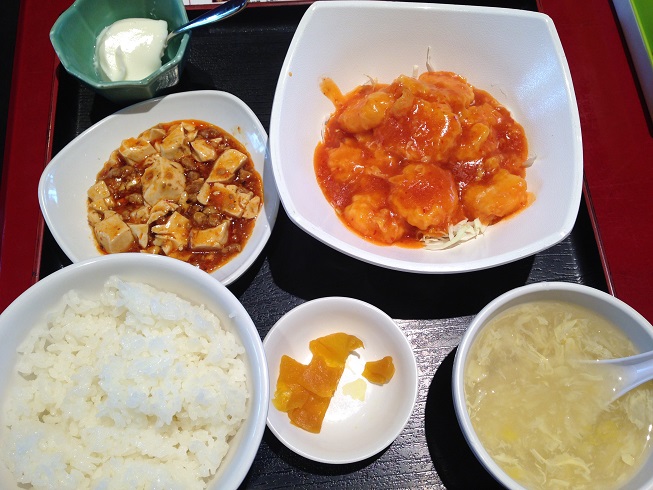 ランチセット、エビチリがあるものを頼みました。900円。エビチリが入って、1000円未満というのは嬉しいですね。エビもそれなりの大きさでした。他のセットもそうですが、コストパフォーマンスはかなりいいと思います。