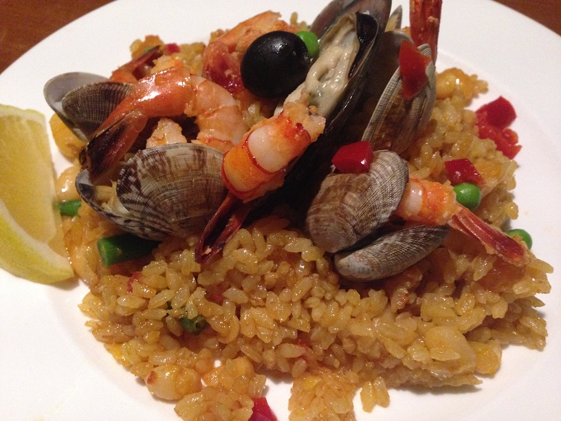 店の前にはパエリアの大きな鍋が存在感を出しているけど、ドアを開けると薄暗い店内で、あまり活気があるとは言えずにちょっと不安になりました。とりあえず、パエヤ、イカの黒煮、コシード、魚介の煮込みのランチコースを頼みました。