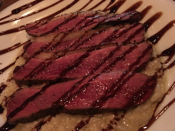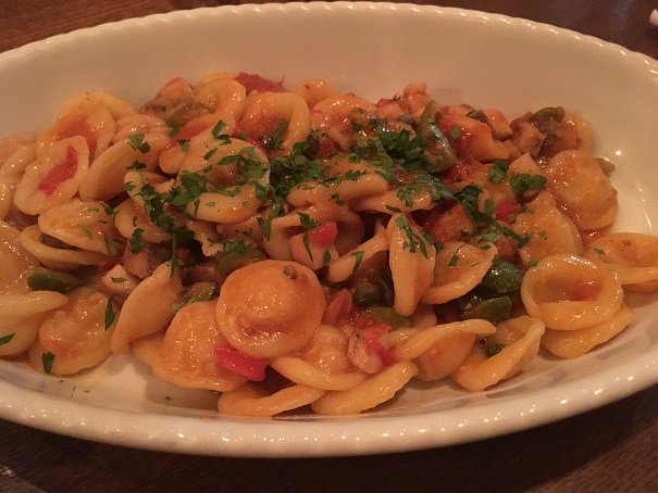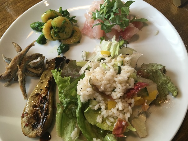 前菜+パスタ+メインのコースを頼んだのですが、前菜が、クオリティが高いだけじゃなく、しっかりと量があって食べごたえがあります。リゾット風のサラダとか、きびなごとか、海老のジェノベーゼっぽいやつとか、美味しいです。これだけで、満足です。