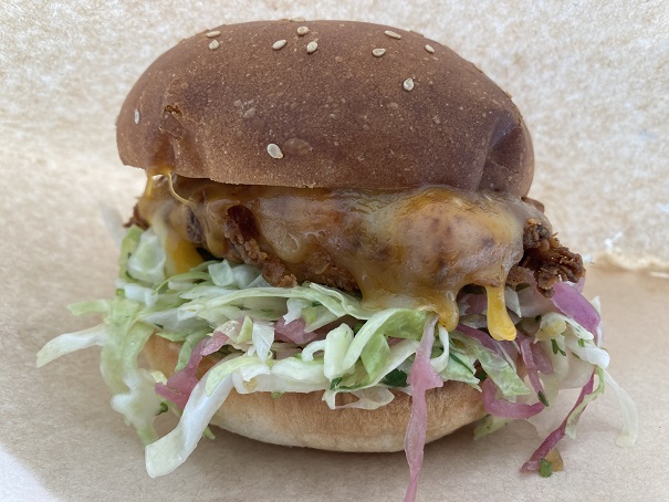 ただ、ハンバーガーにすると、チキンも野菜もバンズから出てしまって、食べにくさはハンパないです。何かしら工夫があると嬉しいのですが。