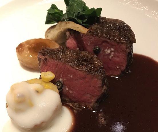 レ・ミロワールのグルマンコース、魚と肉のダブルメインで、どちらもソースが美味しく、ボリューム満点で大満足でした。